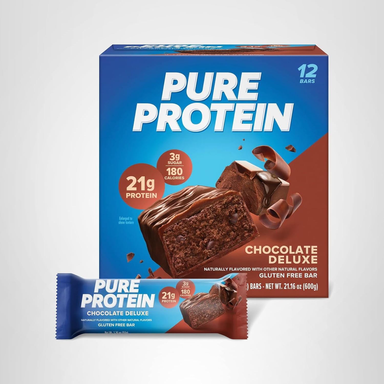 - NEW LOOK! One 12 count box of Pure Protein Chocolate Deluxe Protein Bars