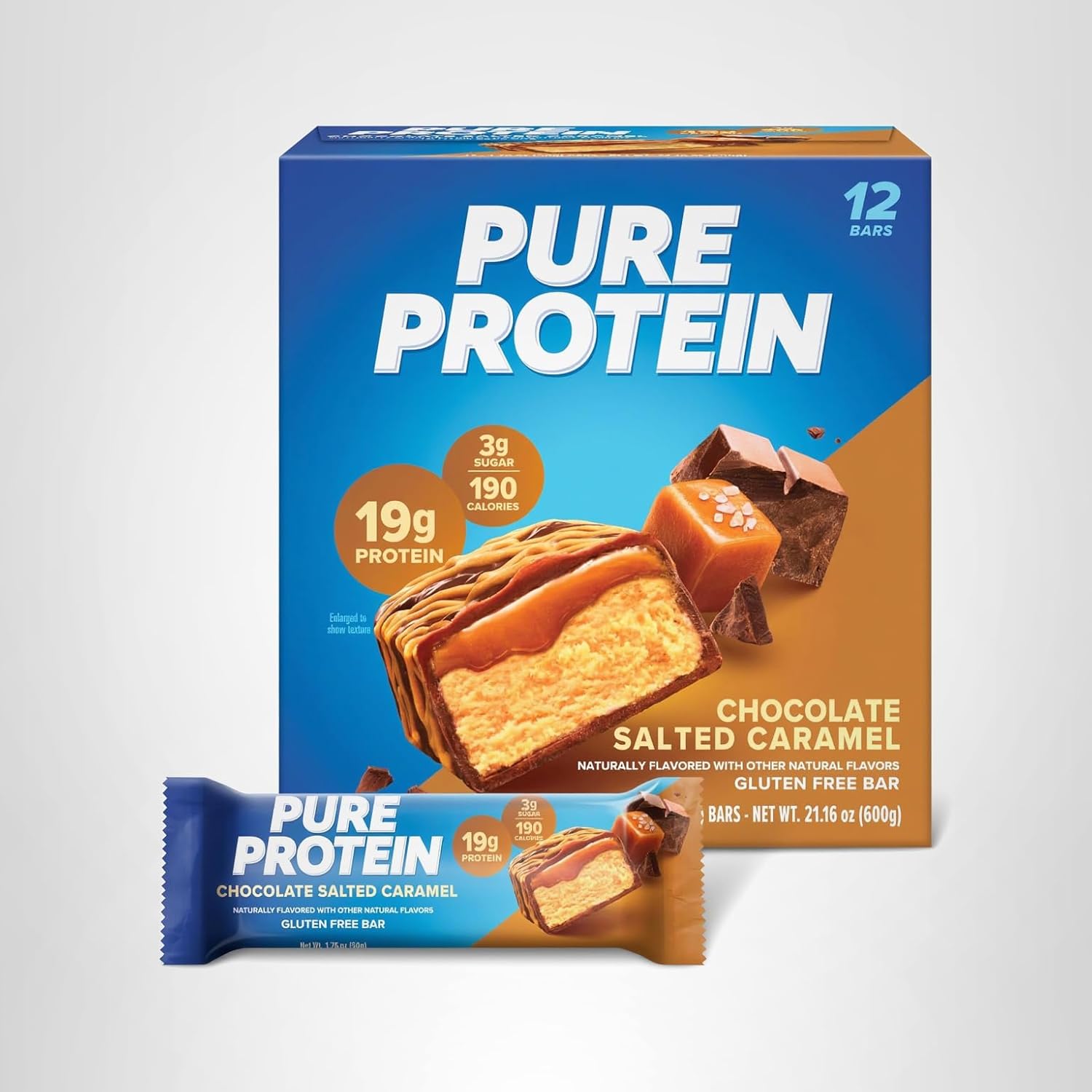 • NEW LOOK! One 12 count box of Pure Protein Chocolate Salted Caramel Protein Bars